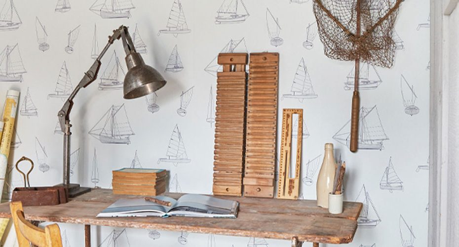 Thus she sketched the boats which, in time, evolved to create beautifully made wallpaper, now available in two coastal colours.